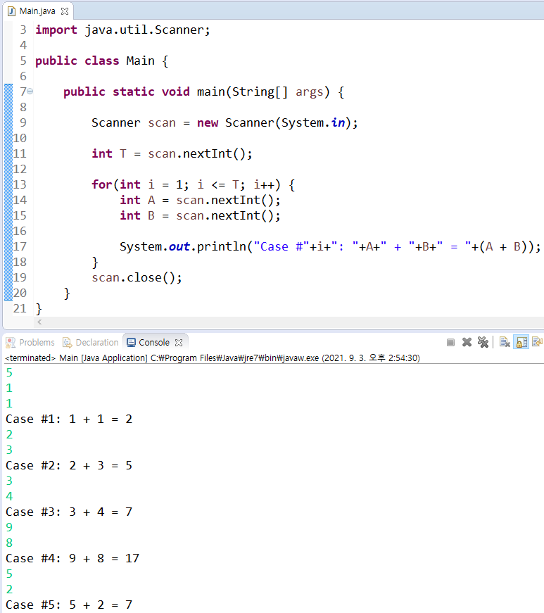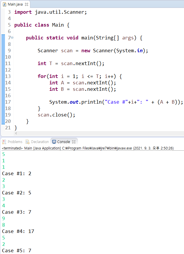 ๊ฐ ํ ์คํธ ์ผ์ด์ค๋ง๋ค "Case #x: A + B = C" ํ์์ผ๋ก ์ถ๋ ฅํ๋ค. x๋ ํ ์คํธ ์ผ์ด์ค ๋ฒํธ์ด๊ณ 1๋ถํฐ ์์ํ๋ฉฐ, C๋ A+B์ด๋ค.