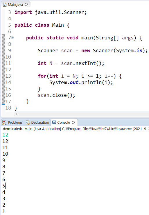 ์์ฐ์ N์ด ์ฃผ์ด์ก์ ๋, N๋ถํฐ 1๊น์ง ํ ์ค์ ํ๋์ฉ ์ถ๋ ฅํ๋ ํ๋ก๊ทธ๋จ์ ์์ฑํ์์ค.